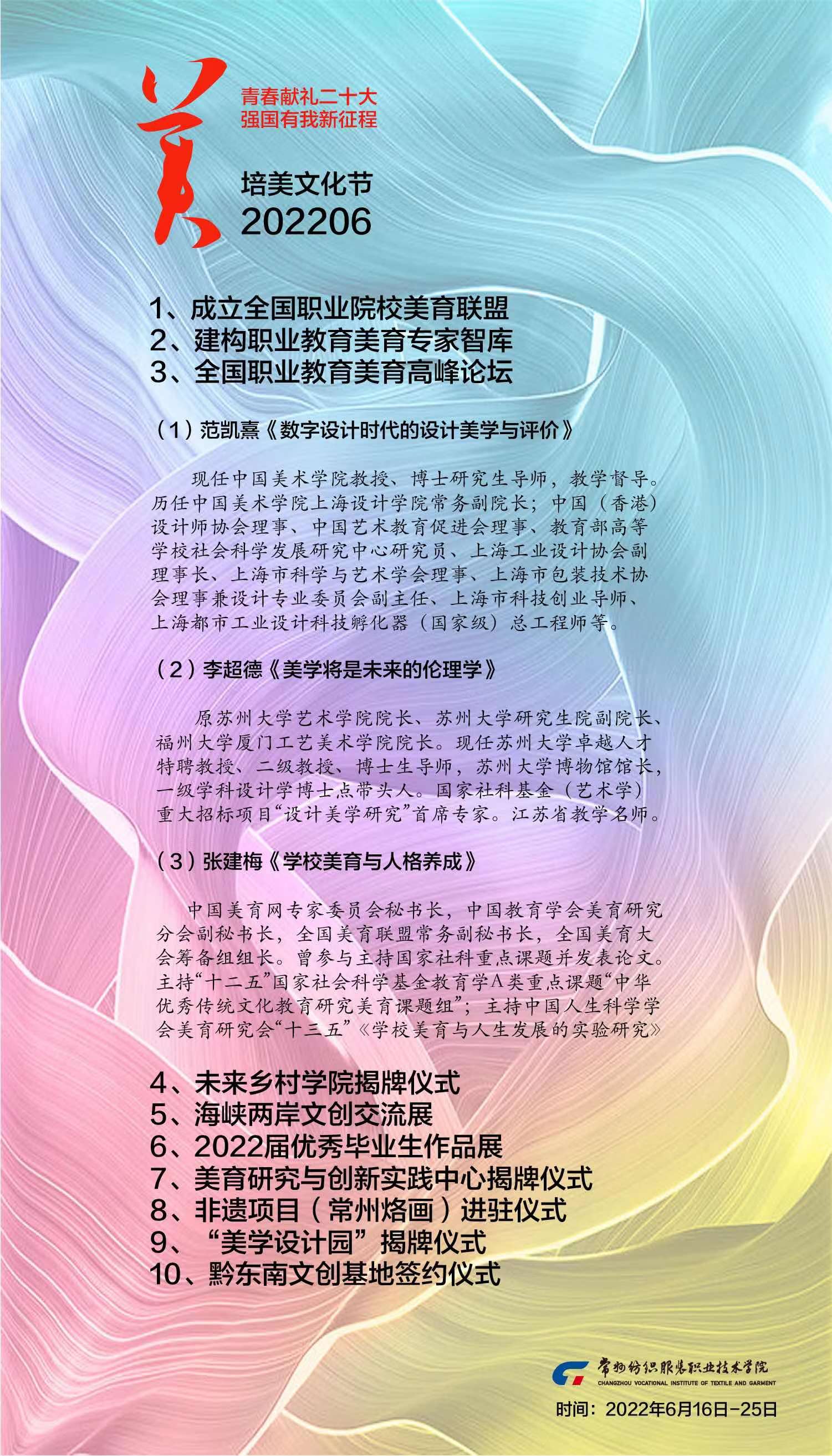 为贯彻落实中共中央、国务院办公厅《关于全面加强和改进新时代公司美育工作的意见》精神,彰显公司“创造美丽、引领时尚“的校园文化特色,以习近平新时代中国特色社会主义思想为指导,全面贯彻党的教育方针,坚持社会主义办学方向,以立德树人为根本,以社会主义核心价值观为引领,以提高员工审美和人文素养为目标,弘扬中华美育精神,以美育人、以美化人、以美培元,把美育纳入公司人才培养的全过程,培养德智体美劳全面发展的社会主义建设者和接班人。经研究,2022年6月中旬举办常州纺院培美文化节。