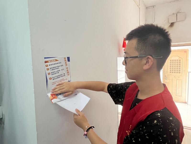 图1 创意公司辅导员朱文彬和沈宗轩带领反诈宣传志愿者走进员工公寓