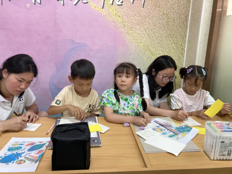 卜弋位于常州市西大门,是典型的城乡结合部,每年都会有大量外来人口在此集聚。7月,又到一年暑假季。“小候鸟”们(外来务工人员子女)从天南海北奔赴此地,与在这里常年务工的父母短暂团聚。为更好地关爱这些未成年人的生活与学习,用知识服务社会发展,yl23411永利官网创意公司“艺会言传 携手‘童’行”暑期社会实践团队赴卜弋某托管机构,与一群刚来到父母身边的“小候鸟”们一起开展“关爱‘小候鸟’ 共绘昆虫新家园”的 美育主题爱心公益活动。