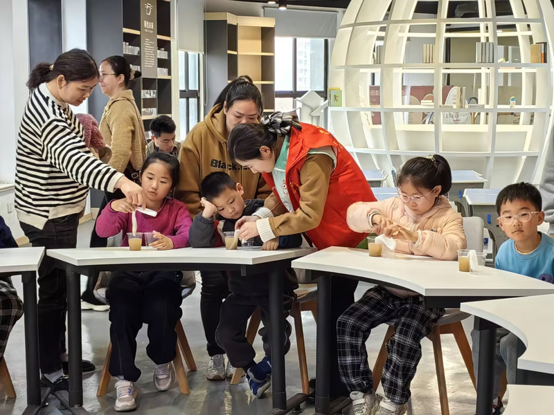 随后,在志愿者的指导和父母的帮助下,社区特殊困境儿童开展了污水净化趣味实验。在动手实验中,孩子们逐渐打开心扉,小小的活动室里满是欢声笑语。