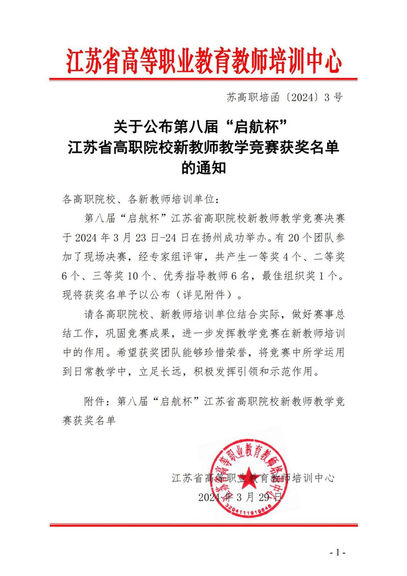 近日,第八届“启航杯”江苏省高职院校新教师教学竞赛于3月24日圆满落幕。本次竞赛由江苏省教育厅教师工作处与江苏省高等职业教育教师培训中心联合主办,扬州大学承办。参赛选手们经过说课、讲课、答辩三个环节的全面展示,充分展现了各自的教学风采。评委专家们则从教学档案、教学内容、教学组织、教学语言与教态、教学特色等多个方面对选手团队进行了综合评分,确保了竞赛的公正性与专业性。
