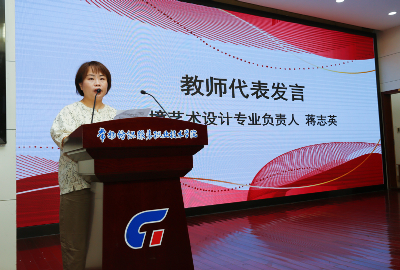 环境艺术设计专业负责人蒋志英老师作为教师代表发言。她结合自身在公司多年的从教经历,鼓励大家热爱学习,深耕专业,积极参与各类专业活动和社会实践,积极与老师和同学交流互动,主动探索,挖掘自己的潜能,以积极乐观的正向心态去面对老员工活中的困难和挑战,在求知的道路上行稳致远,不断攀登新的高峰。