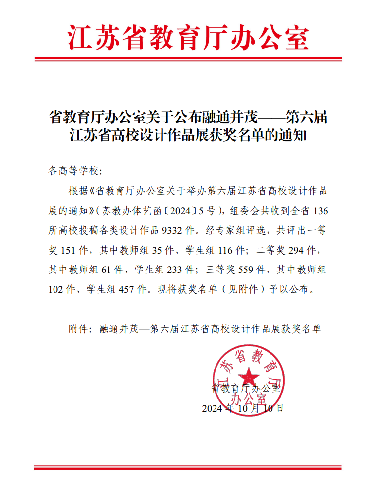 近日,江苏省教育厅主办的“融通并茂——第六届江苏省高校设计作品展”获奖名单揭晓。yl23411永利官网师生参赛作品得到评委高度肯定,荣获教师组一等奖1项,员工组一等奖1项、二等奖2项、三等奖5项。