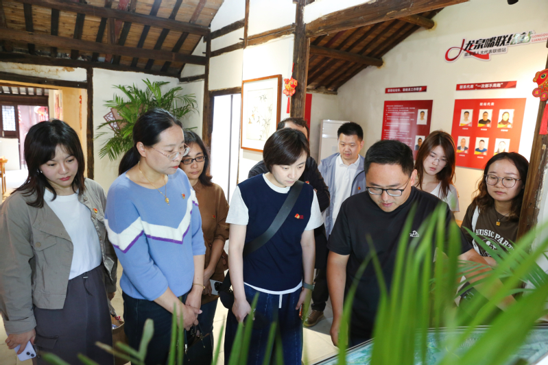 第一站先参观了盛泽镇龙泉嘴村。该村是江苏省特色传统村落、特色田园乡村,是盛泽镇推进乡村振兴、打造乡村文化品牌的标杆之一。龙泉嘴村党委书记、主任潘晓丰带领党员们参观了龙泉嘴村,介绍了近年来龙泉嘴村在党建和乡村振兴方面的创新举措和实践成果。大家还参观了落户在村里的服装企业——龙泉禧里,深入了解盛泽的丝绸文化。